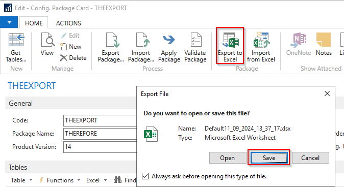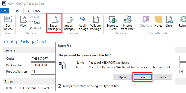 Export the configuration by clicking on “Export Package…” and then on “Save”: