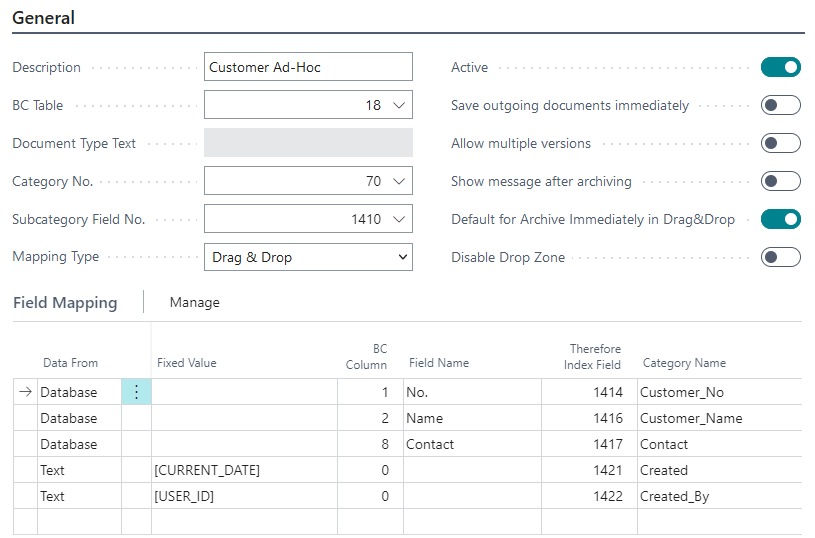 All options except for Active and Default for Archive Immediately in Drag&Drop are disabled and no reports are configured, as this mapping is just used for Ad-Hoc saving of documents on the customer card.