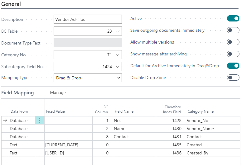 All options except for Active and Default for Archive Immediately in Drag&Drop are disabled and no reports are configured since this mapping is used for ad-hoc saving of documents on the vendor card only.