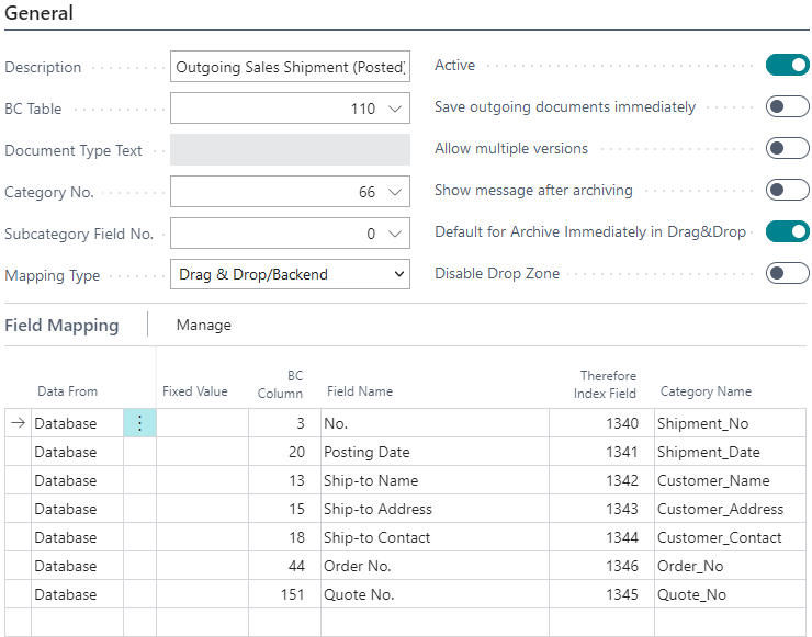 This mapping is executed when a Sales Shipment is posted (e.g., by posting a Sales Invoice or Sales Order). The associated report will generate a document that is then saved to Therefore™.