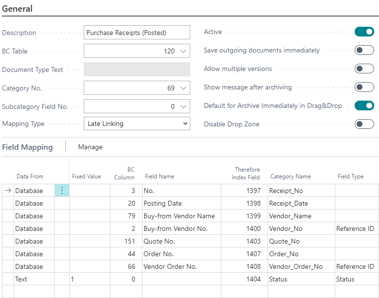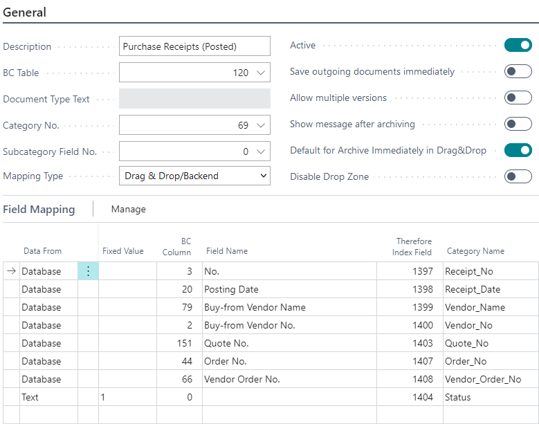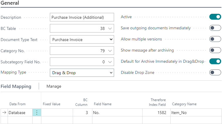 All options except for Active and 'Default for Archive Immediately in Drag&Drop' are disabled and no reports are configured, as this mapping is just used for Ad-Hoc saving of additional documents to a posted Purchase Invoice.