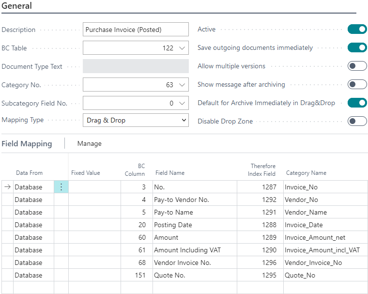 This mapping will be used when posting a Purchase Invoice to update the index data of the invoice that originated from Therefore™. It can also be used for ad-hoc saving of documents.