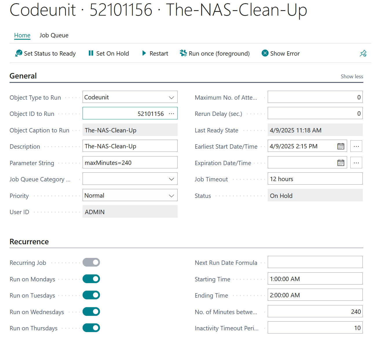 If “maxMinutes” is set, the clean-up will be done in chunks. The configured “Starting Time” and “Ending Time” will not cancel a running NAS Job.