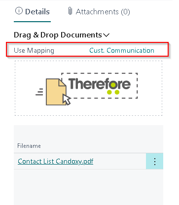 If multiple 'Drag&Drop' mappings exist for one Business Central Page, you can choose which one should be used. This can be useful when you want to use certain types of index data for different use cases or when documents should be stored in different Therefore™ Categories. Next to Use Mapping, the selected mapping that will be used on Drag&Drop is displayed.