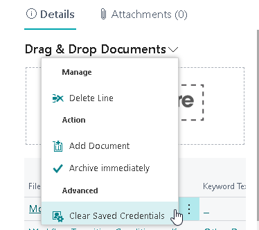 A token is generated to avoid the need of re-entering the credentials. To clear this token, click on the arrow icon next to Drag & Drop Documents and choose Clear Saved Credentials from the menu.