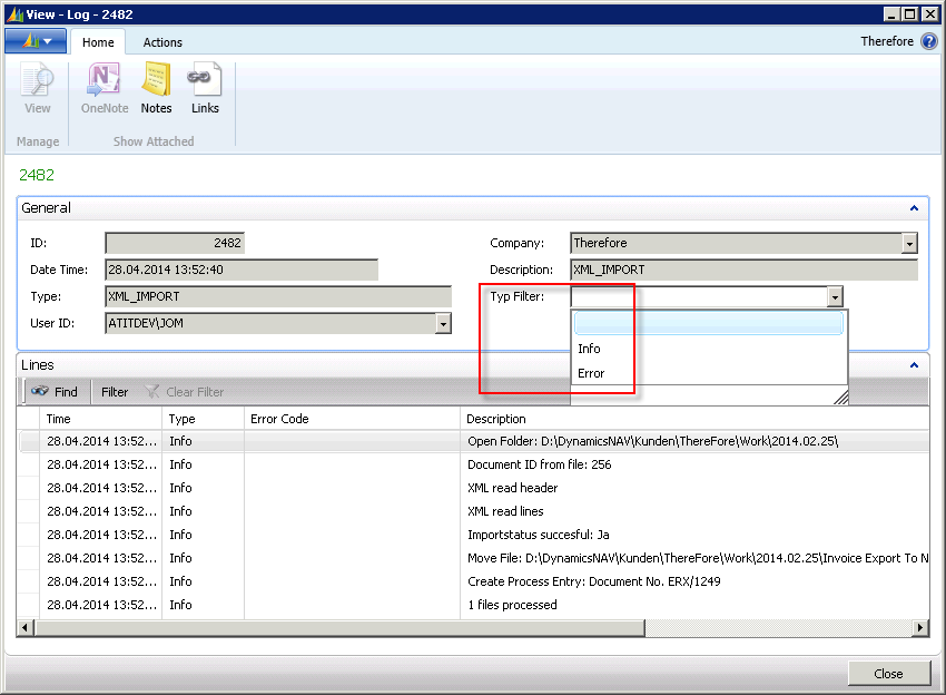 In the detailed view of the event log it is possible to filter out mistakes through the Type Filter. The Description field contains information on detailed processing steps.