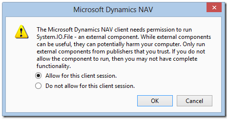 When an external component is executed during a NAV Client Session, as in this case with the Therefore.NAV.Server, the warning message depicted in the image below is displayed.