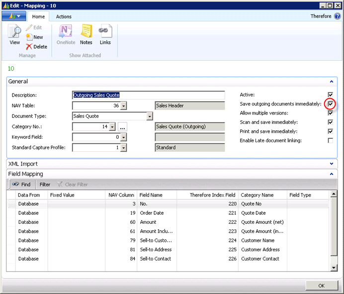 The allocation for sales quotes functions in a similar way. The NAV table used for field allocation is the same as in the sales order, and the NAV documents are archived in the Therefore™ category Sales Quote (Outgoing). However, there is a difference in the immediate saving of outgoing documents.