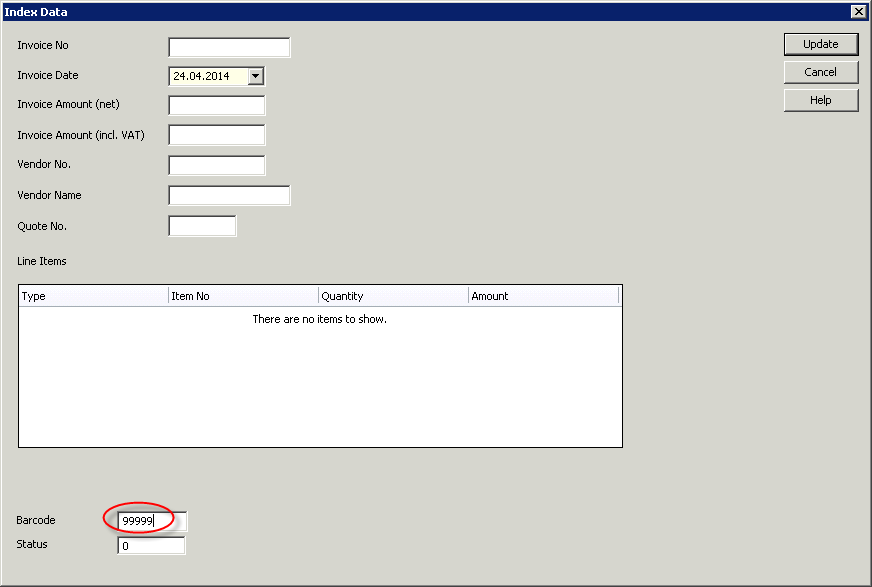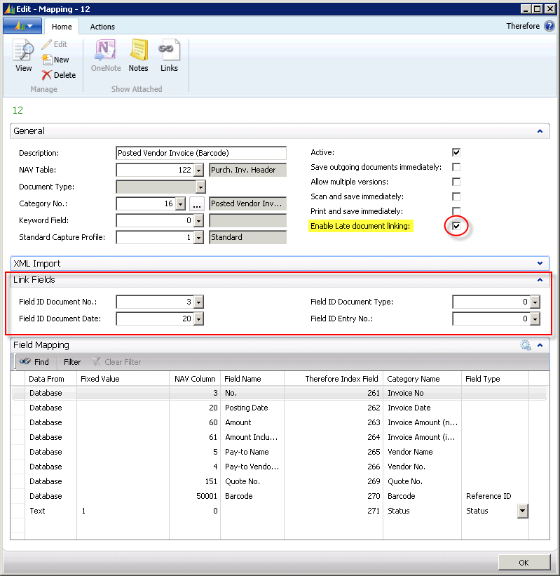NAV 2015 >IncomingDocuments>PostedVendorInvoice (Barcode) and allocating the index data, the barcode also needs to be entered. As the date is a mandatory field, it must also be entered. Mapping index data is carried out through NAV. An identical barcode is sufficient for mapping purposes.