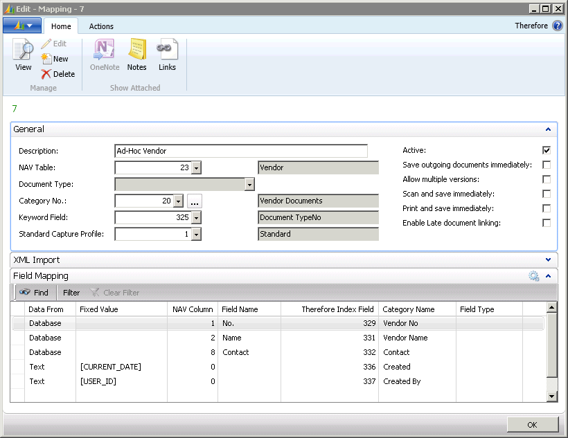 The mapping of Therefore™ documents to vendors is similar to the mapping process described above. The settings of the mapping shown below are accordingly almost the same. The fields from the NAV Table 23 (Vendor) serve as the data source and are saved to the Therefore™ archive in the Vendor Documents folder.