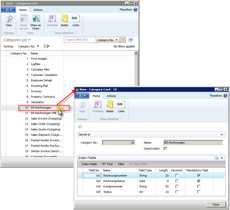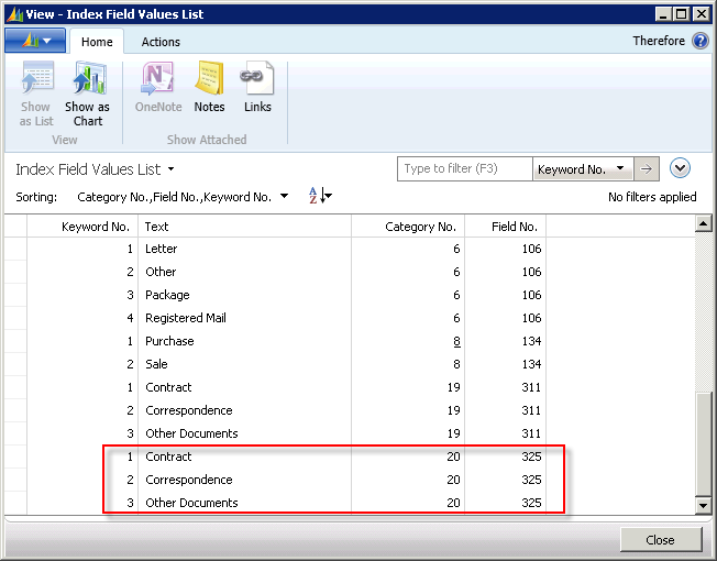 Some fields in Therefore™ categories have keywords activated. The list Index field values shows the text values of the keywords of the specific categories, as well as the associated field numbers.