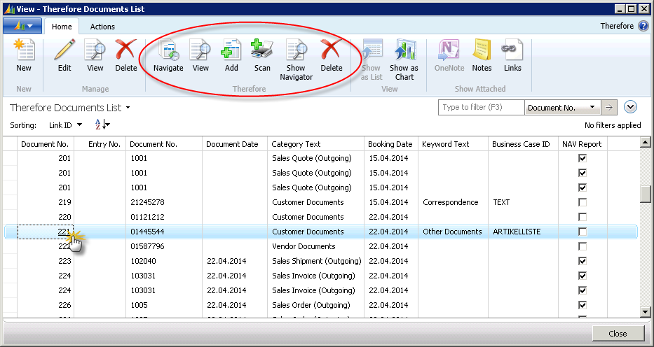 Calling this list from Tables shows an unfiltered list, i.e. all documents are shown where there is a link between Therefore™ and NAV.