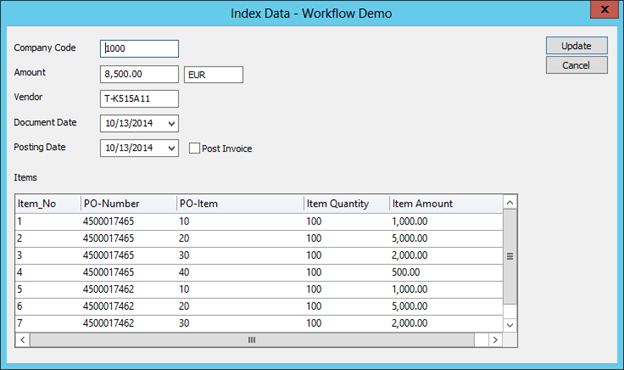 In the screenshot below you can see the index data in Therefore™ of an invoice which has a reference to two different purchase orders.
