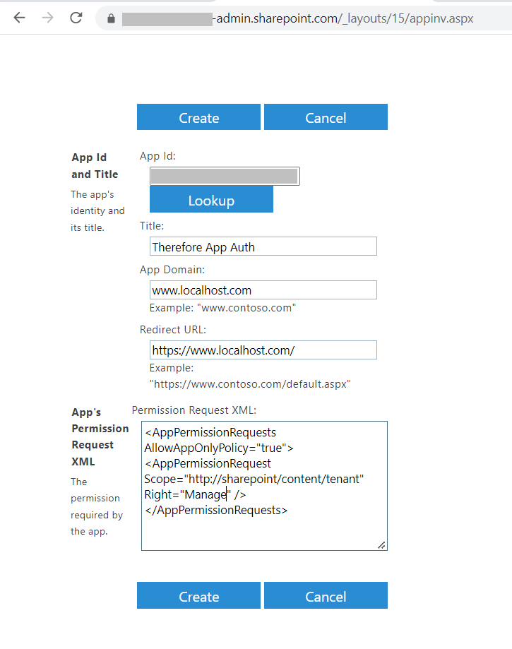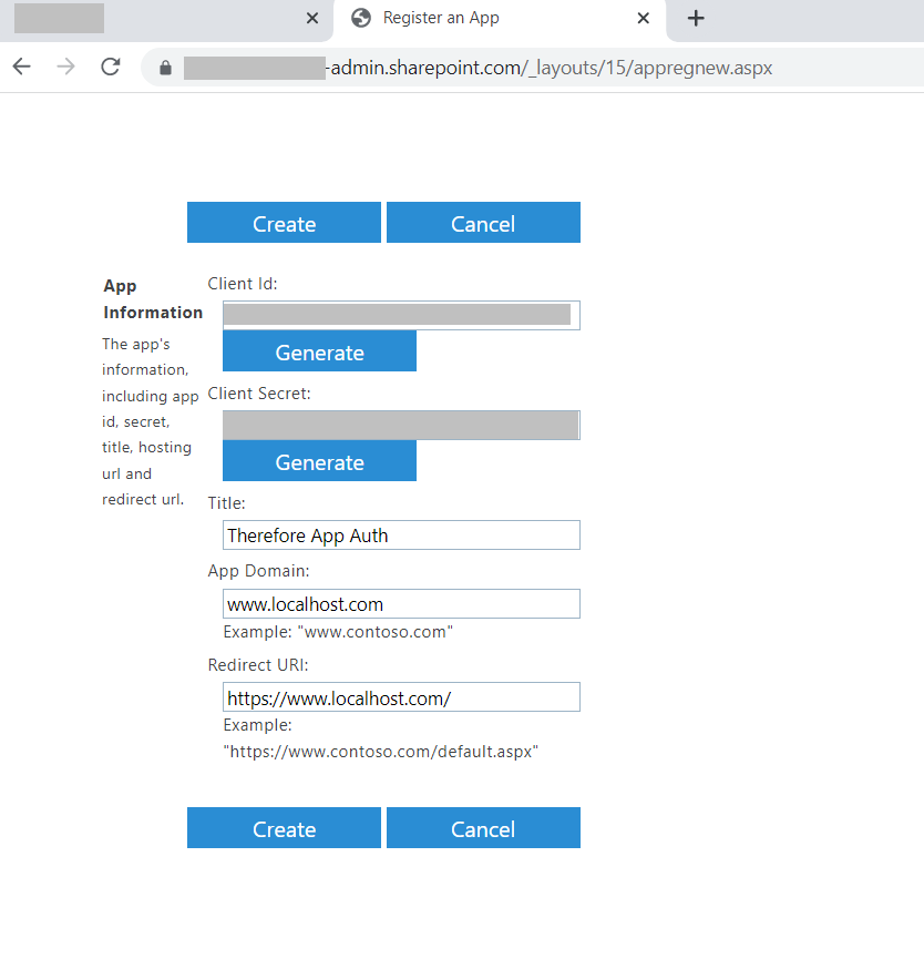 Copy{tenant name}-admin.sharepoint.com/_layouts/15/appregnew.aspxClick the Generate buttons under the respective fields to to create a new Client Id and Client Secret. Give the app an intuitive name. For the App Domain and Redirect URI the configuration shown in the screenshot below will work. Click Create to proceed.