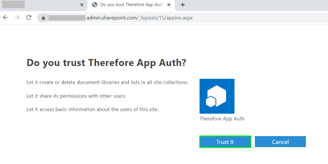 The next step is to set the necessary permissions for the app. To do so, adapt the following URL using your tenant name and enter it in your browser.