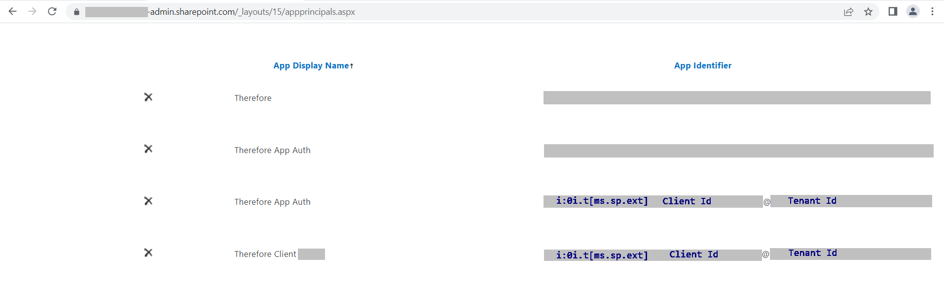 Copy{tenant name}-admin.sharepoint.com/_layouts/15/appprincipals.aspxHere, the Client Ids and Tenant Ids are visible. Please copy the Tenant Id to use it in the next step. The Tenant Id will be the part of the App Identifier that is behind the @ sign.