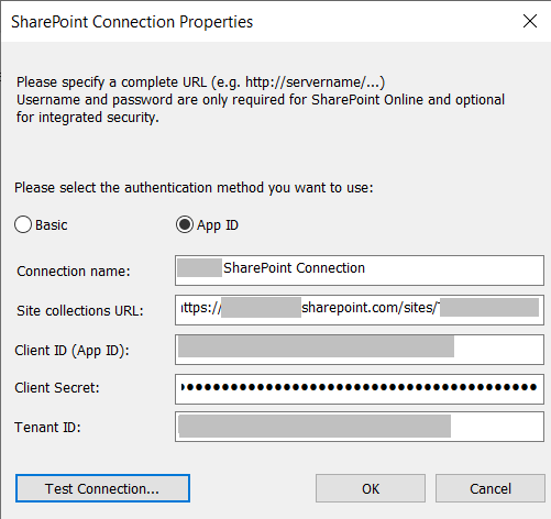 To test the connection, use the following URL with your tenant name under Site collections URL.