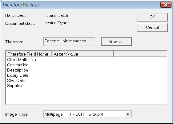 In the Release Script Manager click Add and select ThereforeAscentRelease.inf file. By default the script is available in 'C:\Program Files\Therefore'