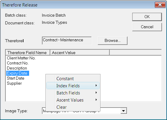 In the Tungsten Capture Administration application you must reference the Therefore™ Release script from the Tungsten Capture Document Class definition. Right-click the name of the Document Class and select the 'Release Scripts' menu item from the context menu.