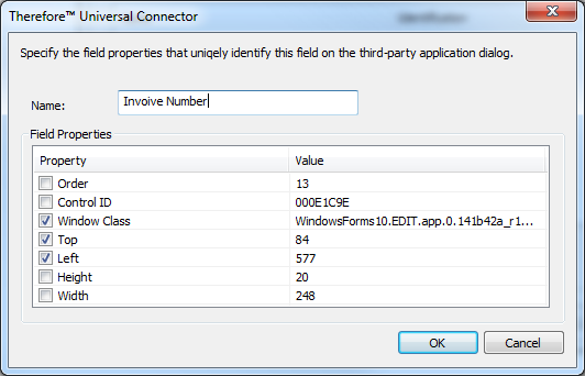 Once we know that the dialog(s) and fields are recognized, the next step is to check whether the position of the fields we would like to map can be determined uniquely. As you can see in the screenshot below, when configuring the connector, we will need to specify which field properties to use for each mapped field. In general we recommend that Windows Class should always be specified. This will avoid possible problems with hidden fields. Then we need a property that will uniquely identify the field.
