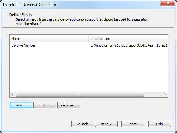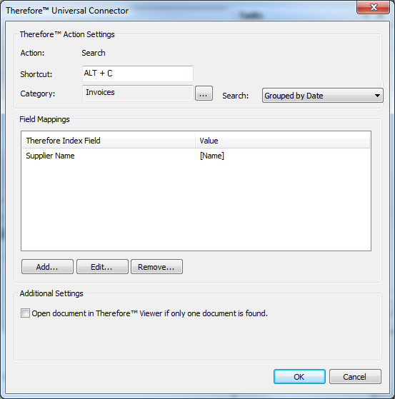 To map a common index field, click Add then select the Index Field in the Therefore™ category that matches the field in the 3rd party application dialog. And then, select the matching value from the list of fields that you defined for the 3rd party application dialog. Click OK once done.