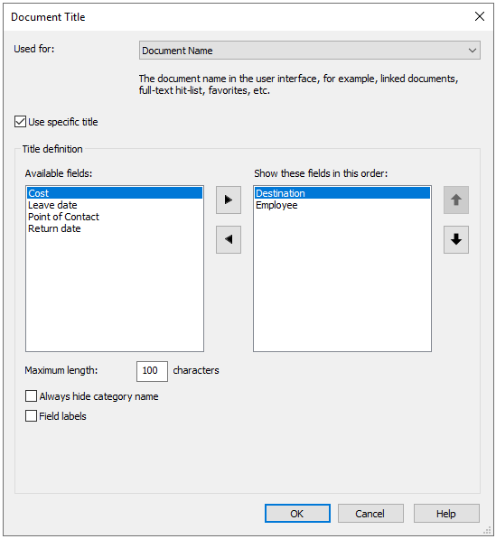Um zu festzulegen, welche Informationen bei einer Volltextsuche angezeigt werden sollen, wählen Sie "Dokumentname" in der Dropdownliste "Verwendet für:". Achten Sie darauf, dass das Kontrollkästchen "Spezifischen Titel verwenden" aktiviert ist.