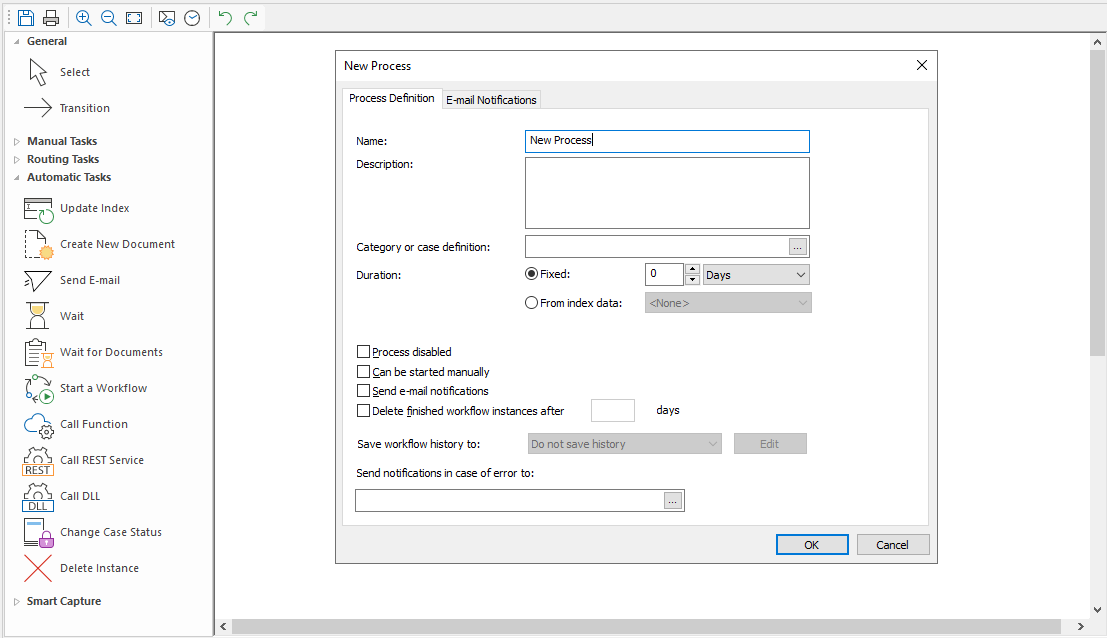 Klicken Sie im Therefore™ Solution Designer mit der rechten Maustaste auf das Objekt "Workflow" oder auf einen Ordner unter dem Objekt und wählen Sie "Neuer Prozess". Dadurch wird die Workflow-Entwurfsseite aufgerufen und es wird ein Dialogfeld geöffnet, in dem Sie den Prozess definieren und die E-Mail-Benachrichtigungen konfigurieren können.