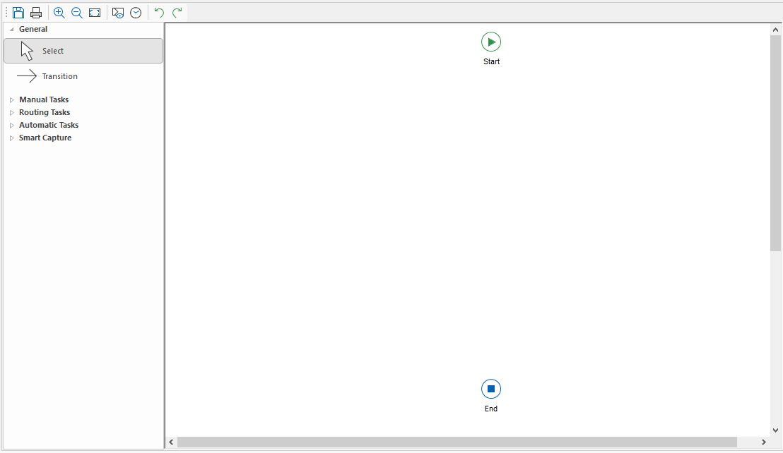 Nach Abschluss der Prozessdefinition wird die Workflow-Entwurfsseite mit zwei Systemaktivitäten (Start und Ende) angezeigt. Links auf der Entwurfsseite können Sie aus den verfügbaren Aktivitäten auswählen und sie zum Workflow hinzufügen, indem Sie sie in den Arbeitsbereich ziehen.
