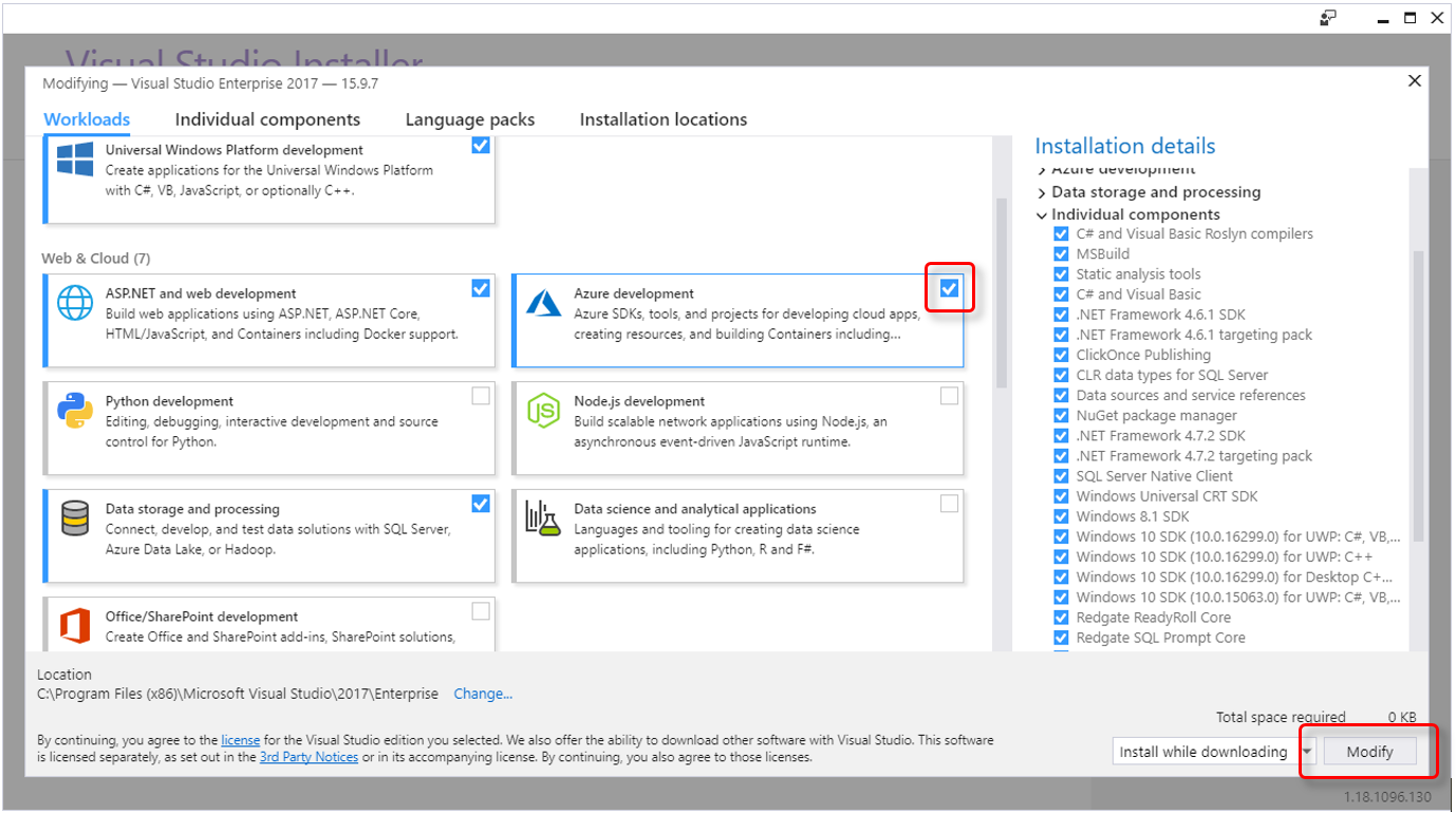 Open the “Workloads” tab and look for “Azure development”. Activate the checkbox on the top-right and click “Modify” to apply the changes.