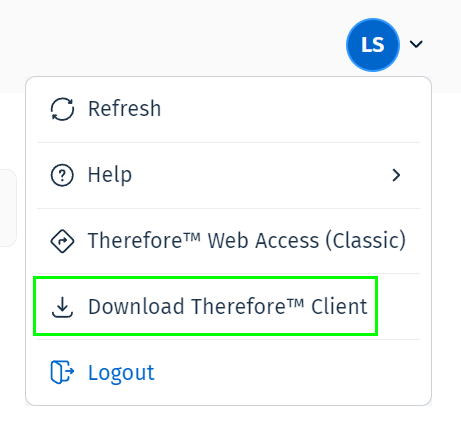 Dans le menu Avatar, cliquez sur l'option « Télécharger le client Therefore™ ».