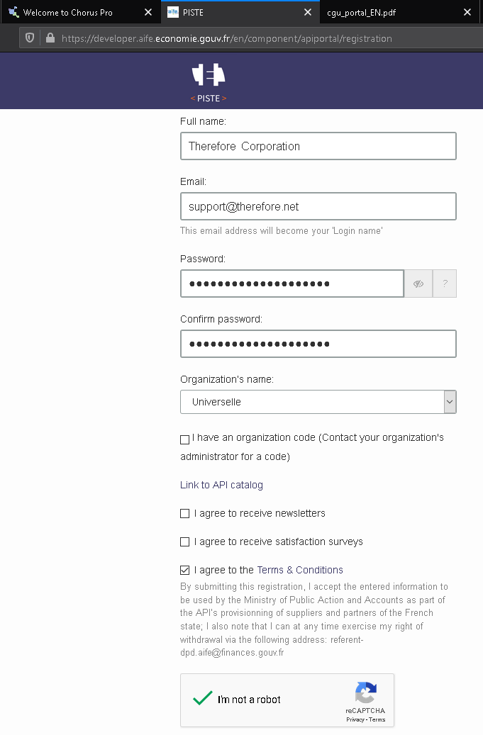 Créez un compte. Un compte PISTE est requis pour établir une connexion sécurisée entre Therefore™ et le portail Chorus. Il permet d’accéder à un jeu restreint de fonctions API à l’aide des informations d’identification PISTE fournies.