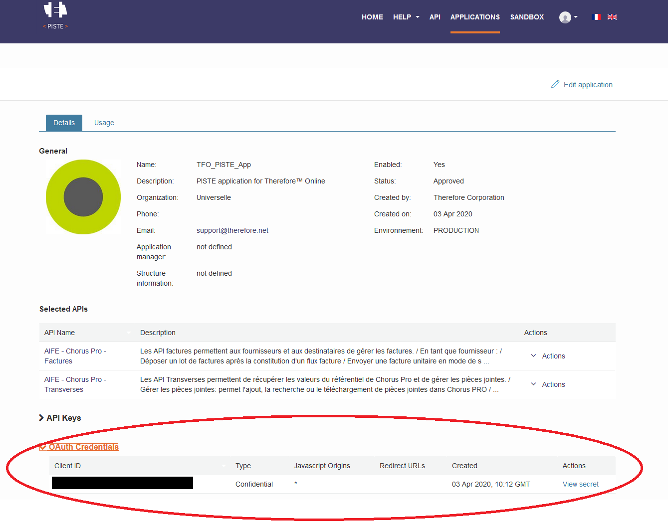 Les informations d’identification OAuth sont affichées sur l’onglet Details (Détails). La valeur ClientID correspond à l'ID de l’application en cours.